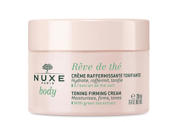 A NUXE Rêve de Thé Feszesítő Testápoló Krém 200 ml a testkontúrra is fókuszáló ápolást kínál, amely megtámasztja és tonizálja a bőrt. A friss zöld tea kivonat feszesíti és rugalmassá teszi a bőrt, míg a rozskivonat gyengéden tonizál és simítja azt.